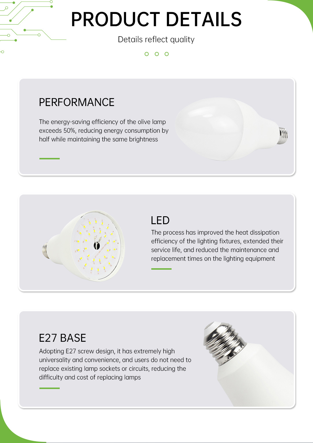 The energy-saving efficiency of the olive lamp exceeds 50%, reducing energy consumption by half while maintaining the same brightness.