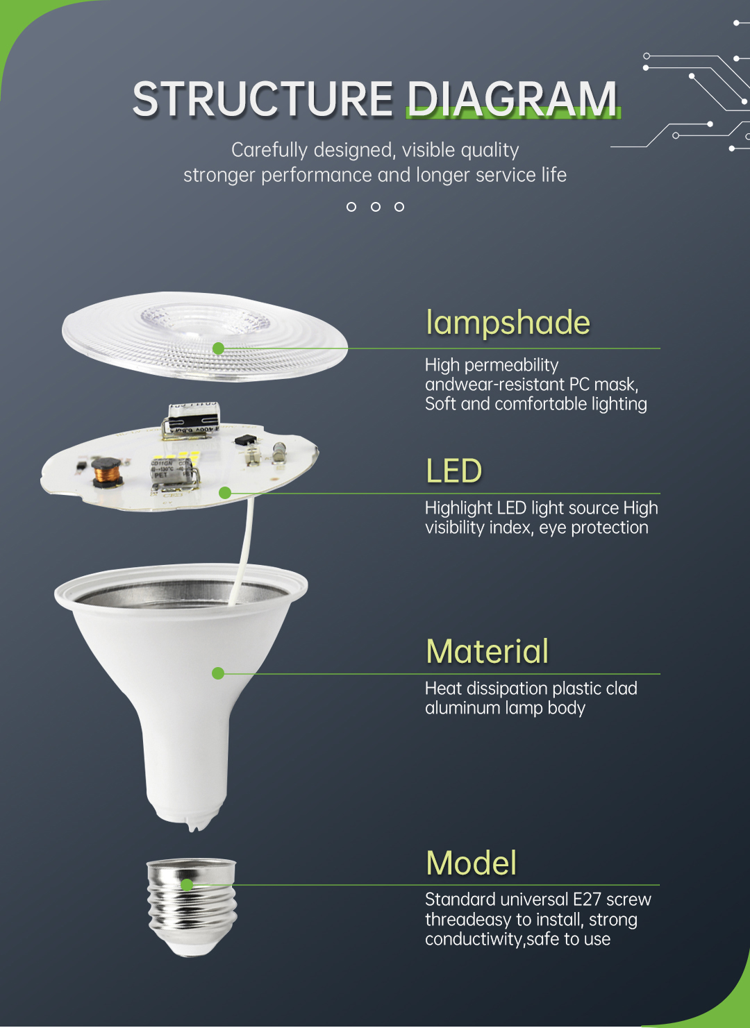 Standard universal E27 screw thread, easy to install, strong conductivity, safe to use.