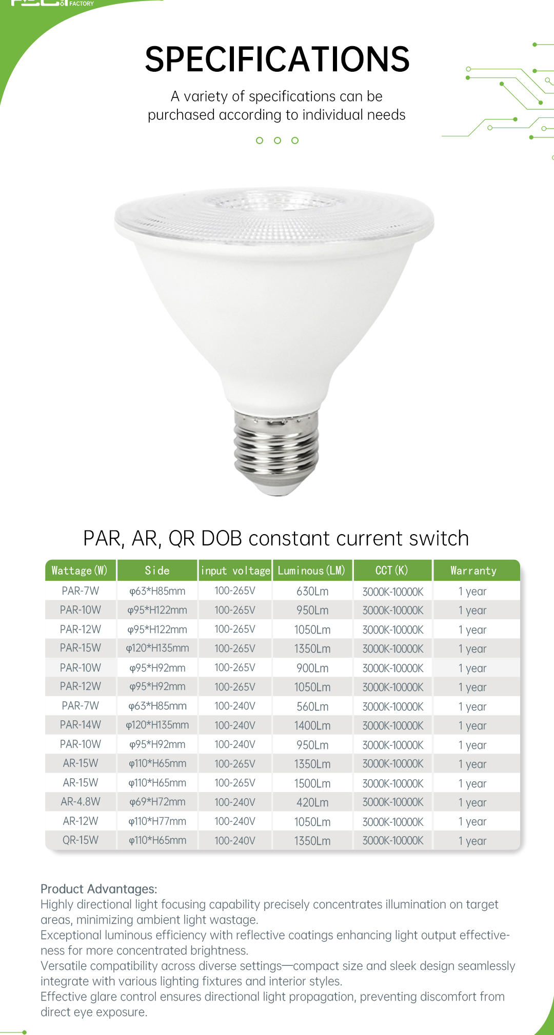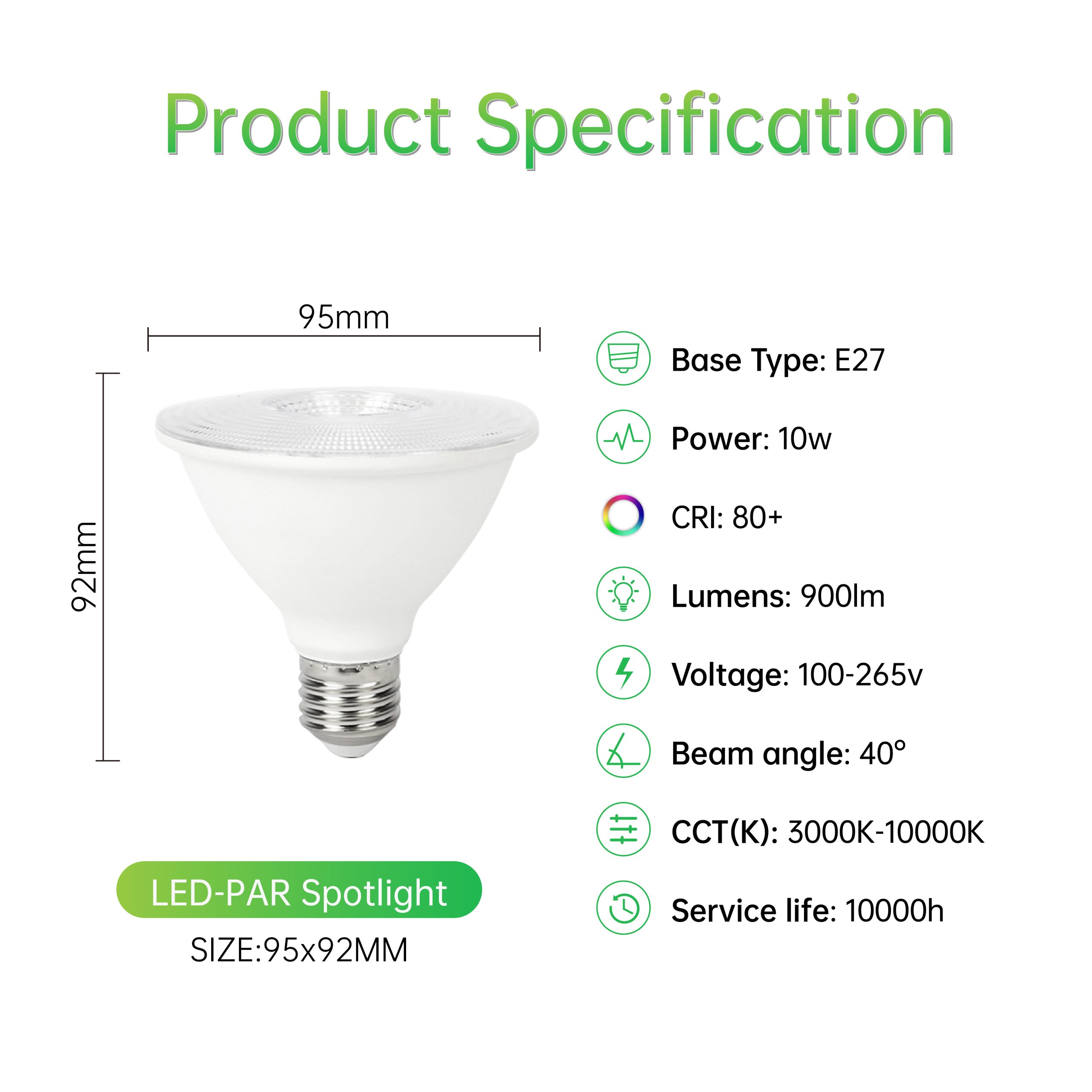 SD/PAR-短脖子款/40°/100-265/IC-DOB/0.5/塑包铝+PC透镜/10/900/830/14LED/E27/PAR30-φ95×H92mm