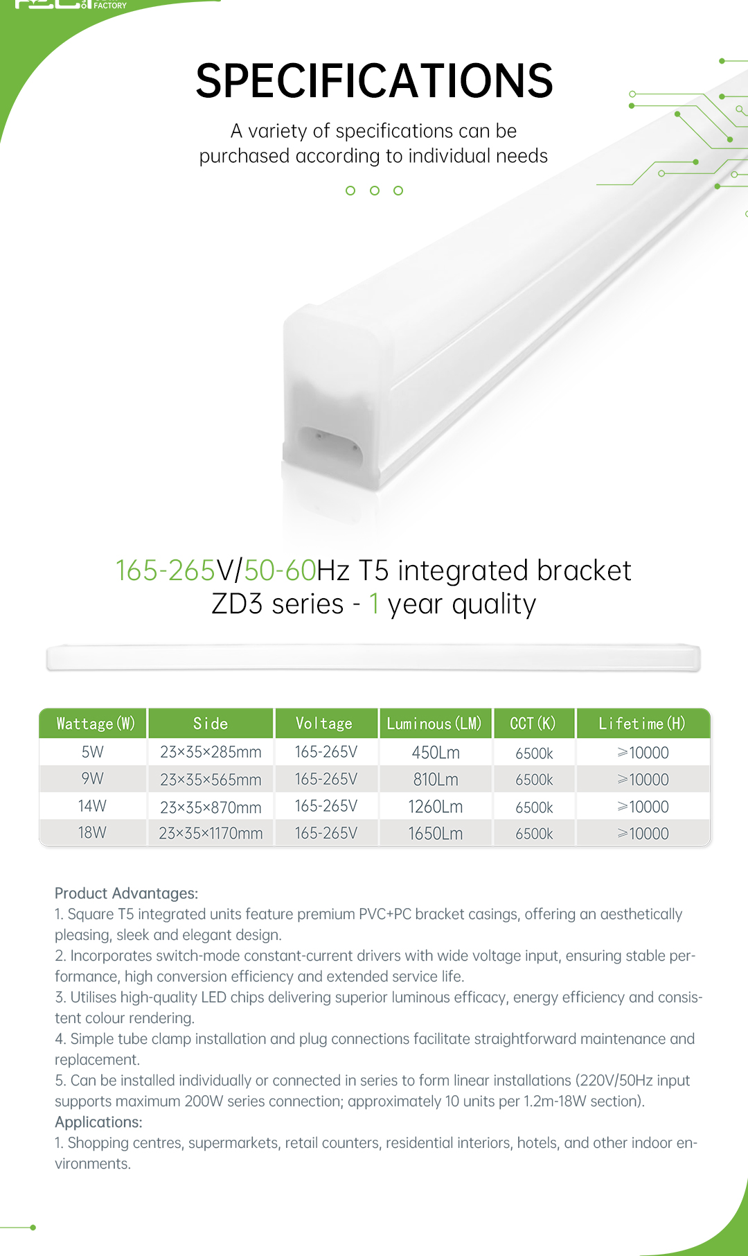 T5一体化支架/ZD3/160°/165-265/IC-驱动/85/1000V/0.5/PVC管+PC罩/A款方形/9/810/765/48LED/565//F