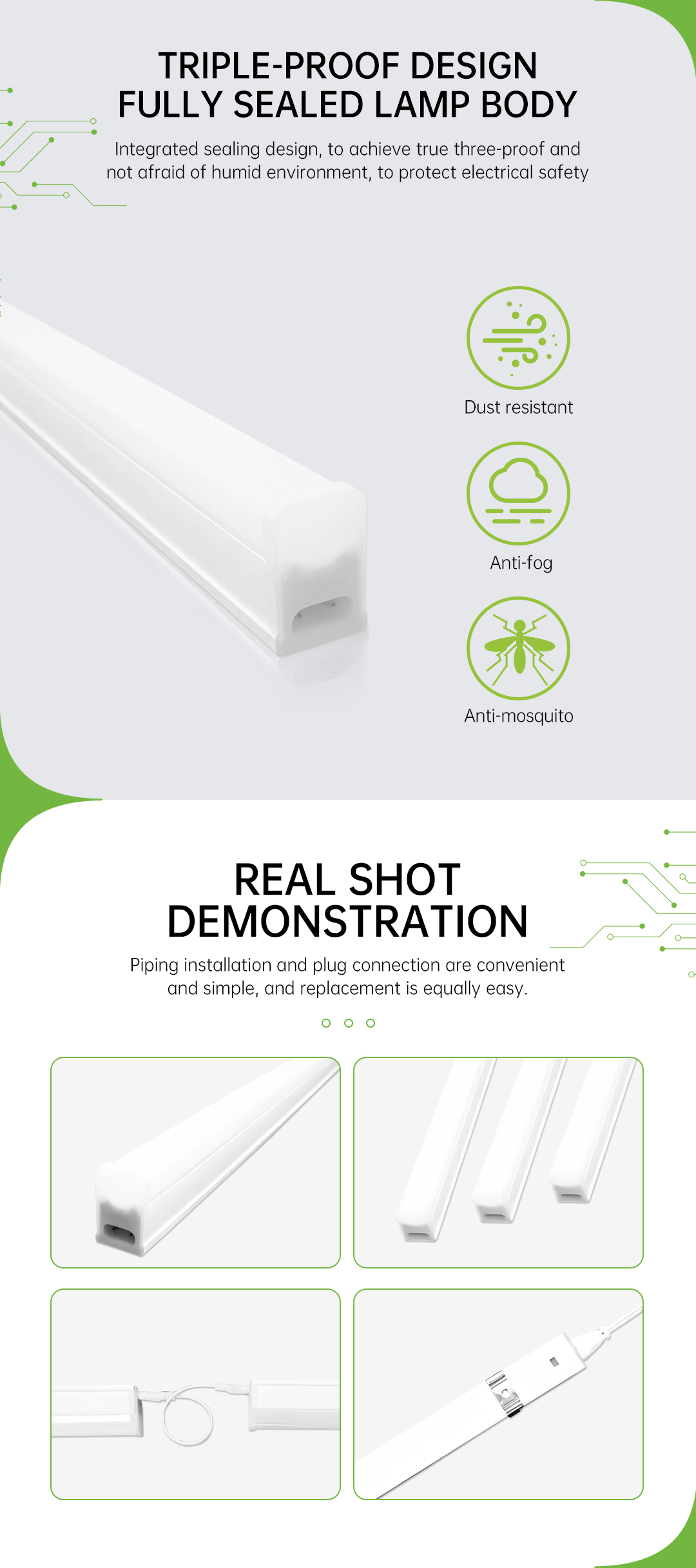 PC plastic tube body, no damage during transportation, 180° wide beam angle, uniform light emission, no dark areas, no glare.