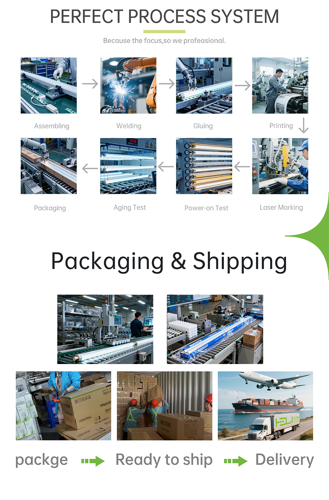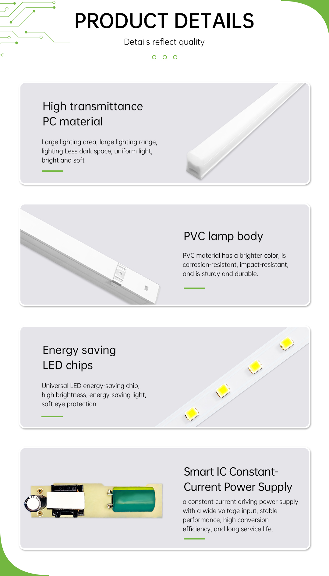 PC plastic tube body, no damage during transportation, 180° wide beam angle, uniform light emission, no dark areas, no glare.