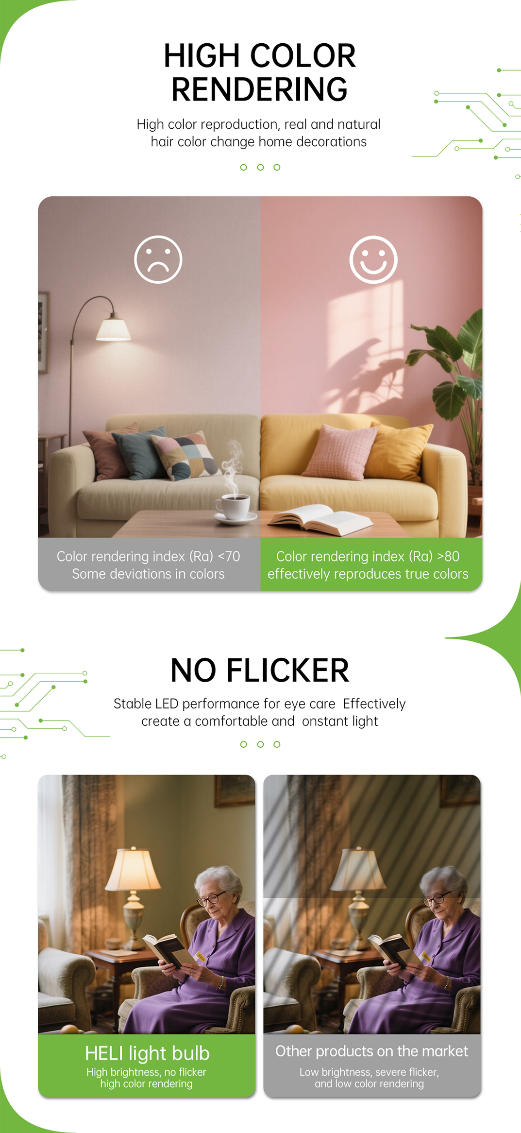 Large lighting area and range, reduces dark spaces, uniform light, bright yet soft.